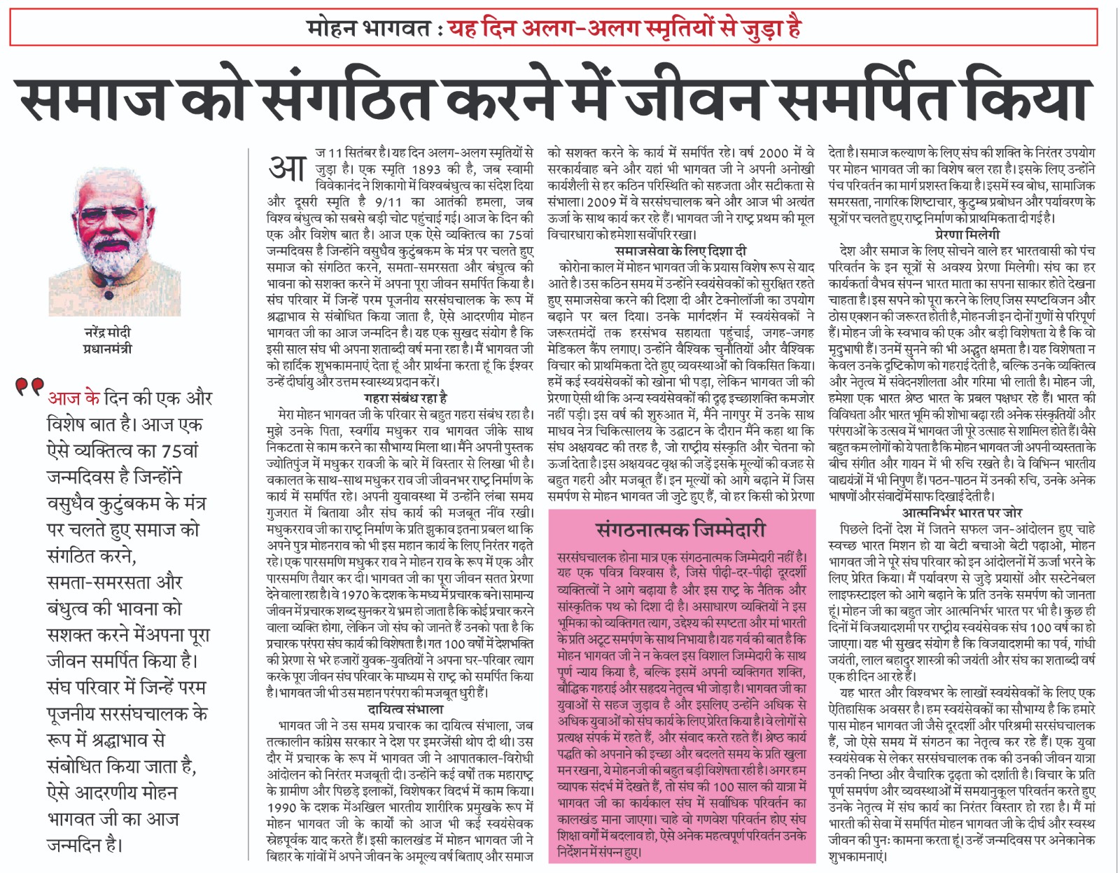 आज 11 सितंबर है। यह दिन अलग-अलग स्मृतियों से जुड़ा है। एक स्मृति 1893 की है, जब स्वामी विवेकानंद ने शिकागो में विश्वबंधुत्व का संदेश दिया और दूसरी स्मृति है 9/11 का आतंकी हमला, जब विश्व बंधुत्व को सबसे बड़ी चोट पहुंचाई गई। आज के दिन की एक और विशेष बात है। आज एक ऐसे व्यक्तित्व का 75वां जन्मदिवस है जिन्होंने वसुधैव कुटुंबकम के मंत्र